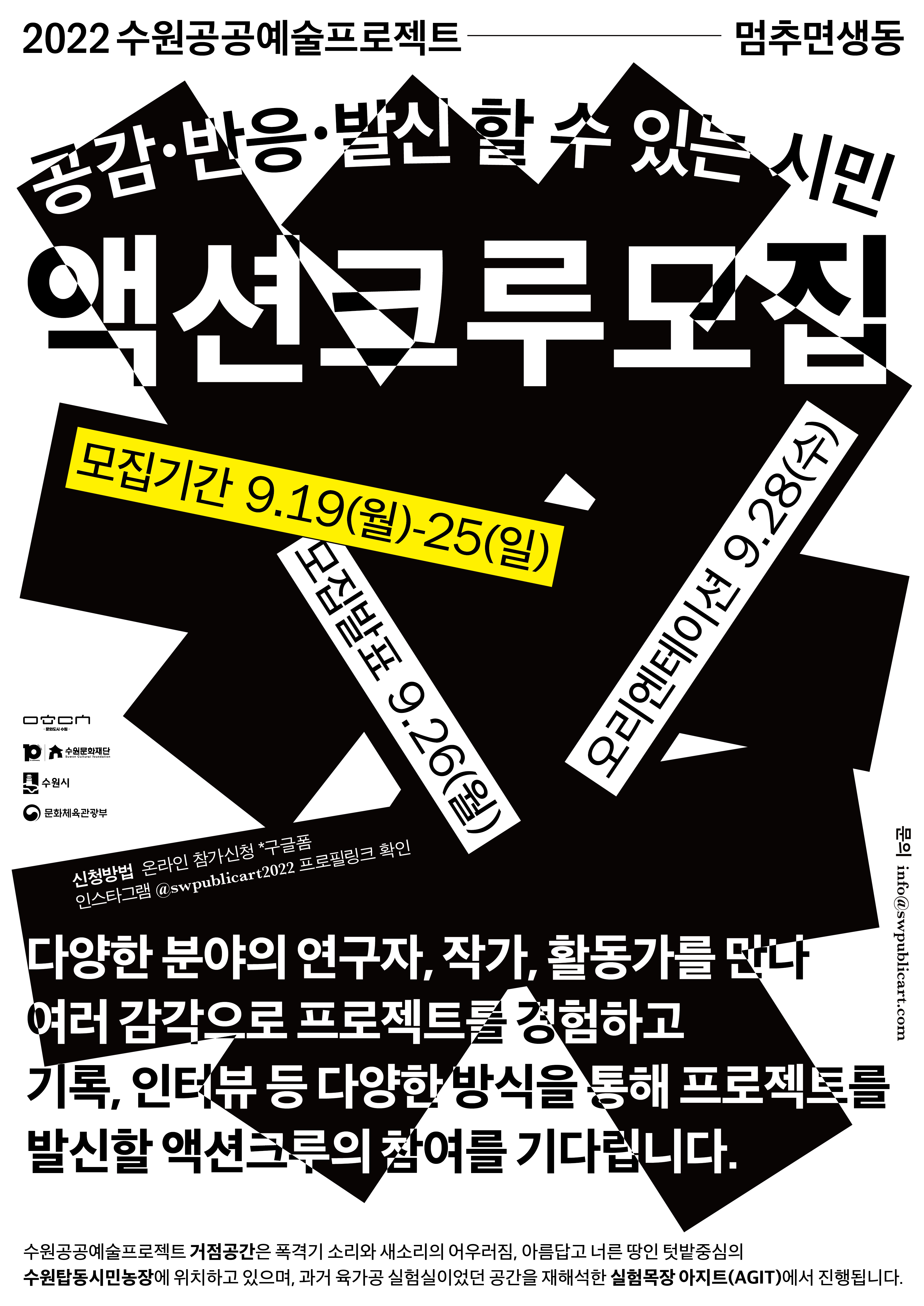 ‘2022 수원공공예술프로젝트'에 공감/반응/발신 할 수 있는 시민 액션크루를 모집 합니다.