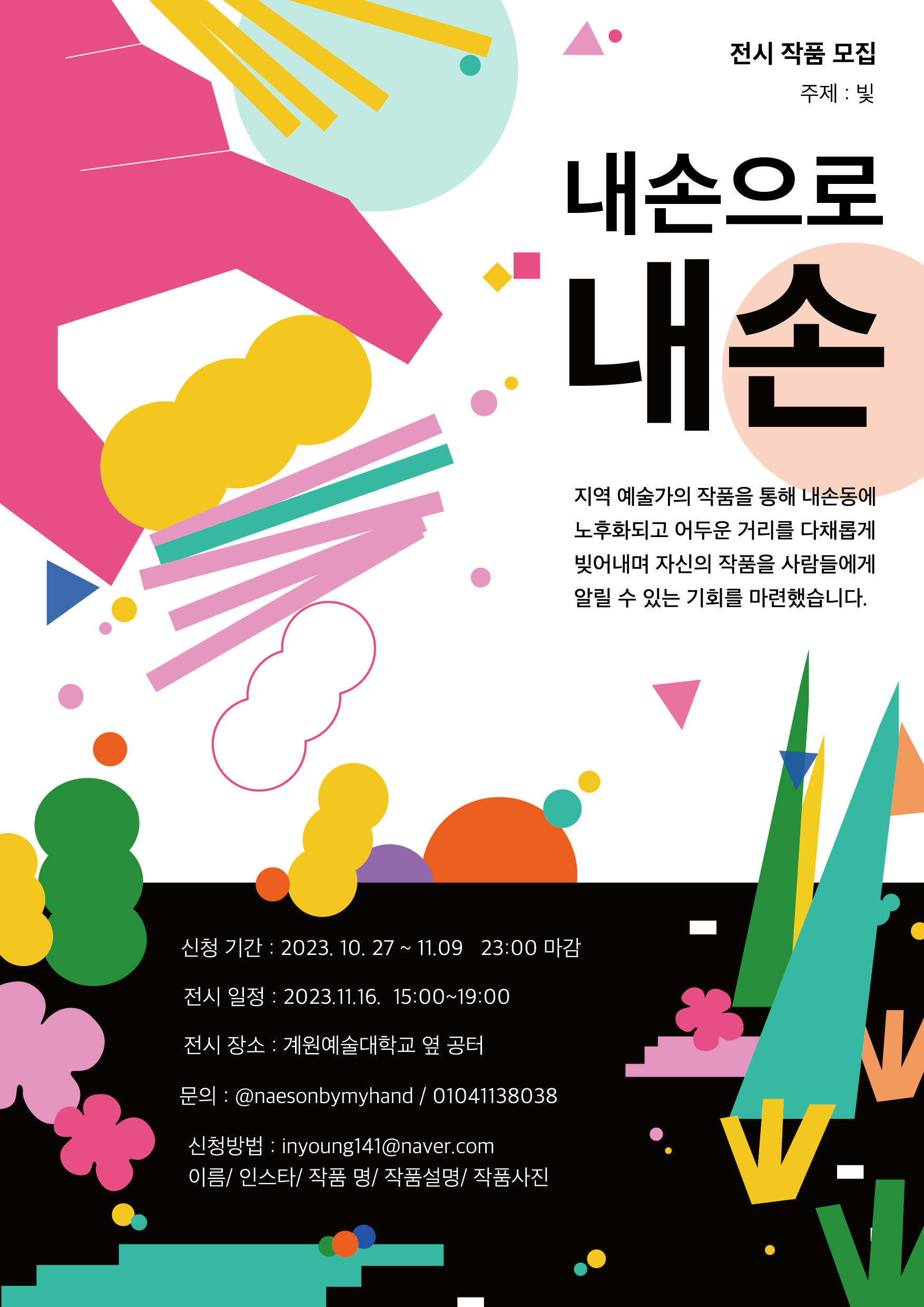 알리기안녕하세요. 계원예술대학교 광고브랜드 디자인과 재학중인 학생입니다. 현재 지역 활성화를 위한 로컬 프로젝트 하나를 기획 중에 있습니다. 길거리 전시를 통해 경기도 의왕시에 위치한 예술의 거리를 활성화 시키는게 목표입니다. 그 과정 속에서 다양한 예술인들의 예술 작품이 필요로 하여 이렇게 전시 작품 모집을 홍보하고자 글을 쓰게 되었습니다.