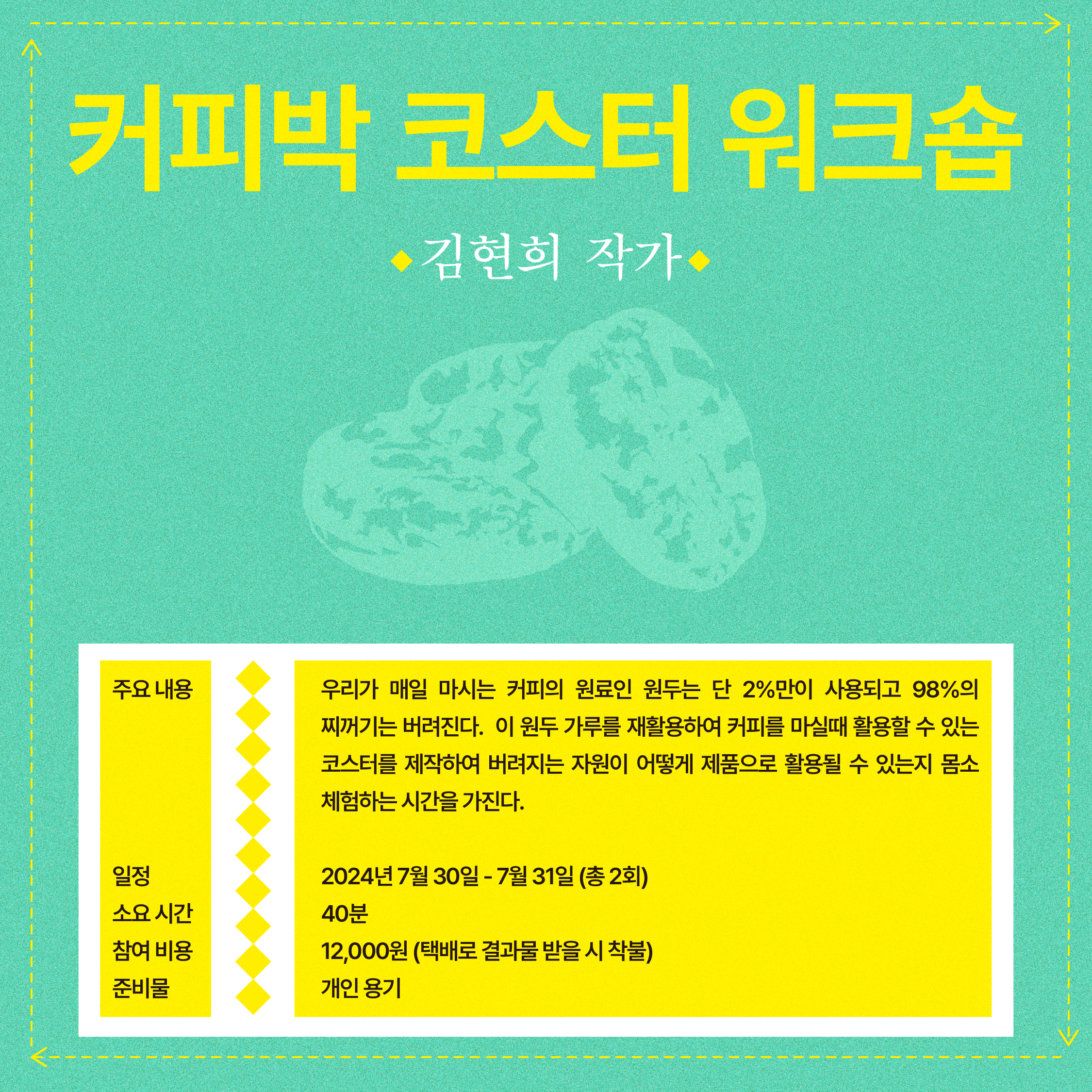 우리가 매일 마시는 커피의 원료인 원두는 단 2%만이 사용되고 98%의 찌꺼기는 버려집니다. 이 원두 가루를 재활용하여 커피를 마실 때 활용할 수 있는 코스터를 제작하여 버려지는 자원이 어떻게 제품으로 활용될 수 있는지 몸소 체험하는 시간을 가져봅니다.