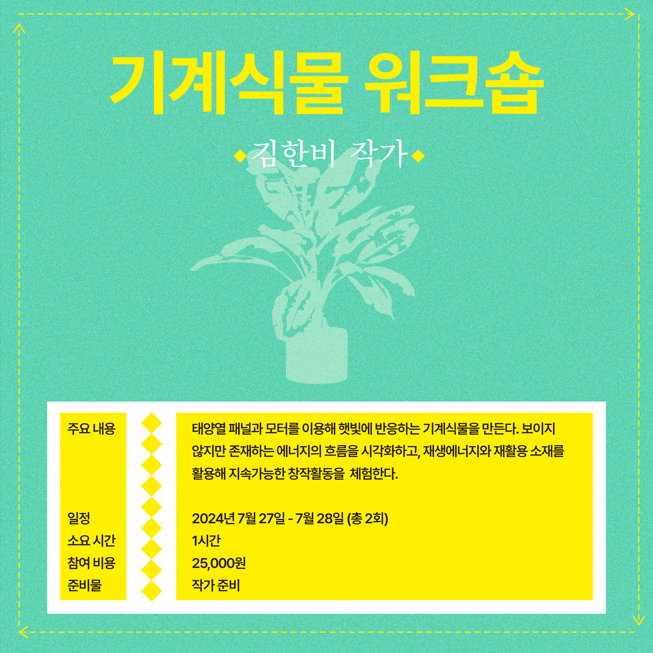 태양열 패널과 모터를 이용해 햇빛에 반응하는 기계식물을 만듭니다. 보이지 않지만 존재하는 에너지의 흐름을 시각화하고, 재생 에너지와 재활용 소재를 활용해 지속가능한 창작활동을 체험합니다.
