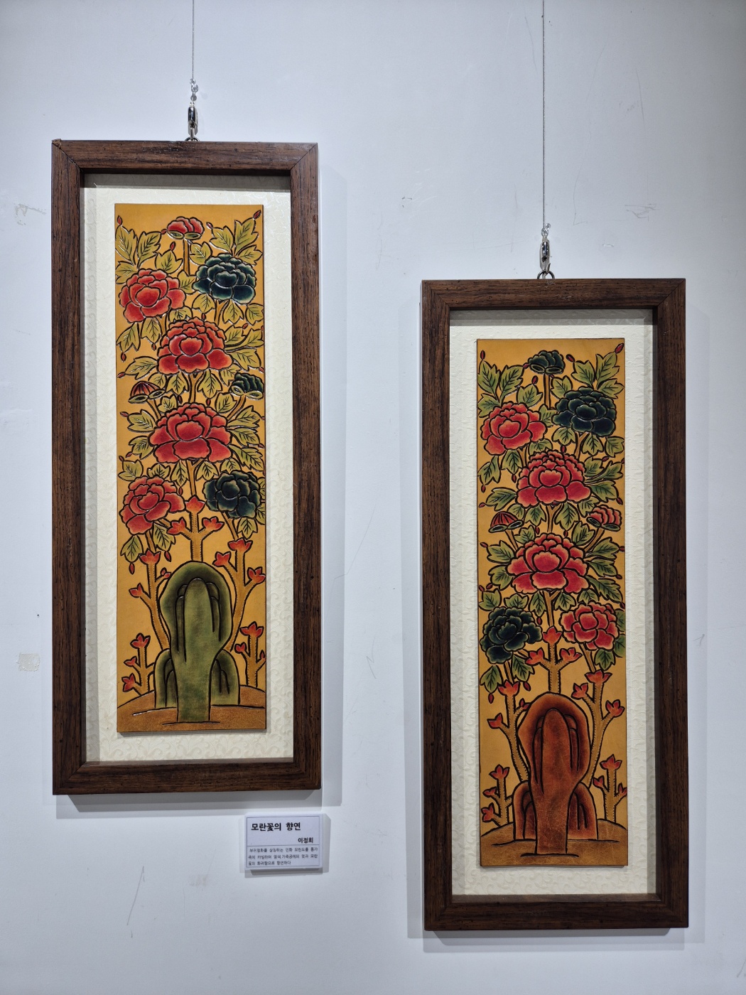 벽면에는 각 작가의 개성이 고스란히 담긴 작품들이 전시되었습니다. 세밀한 카빙과 버닝 기법으로 조각된 작품부터, 백드롭 페인팅을 활용해 자연의 질감을 그대로 담은 작품까지. 각 작품은 단순한 공예를 넘어 하나의 이야기를 담은 예술 작품으로 다가왔습니다. 특히, 자연과 계절의 변화에서 영감을 받은 작품들은 늦가을의 정취를 가득 느끼게 했습니다.