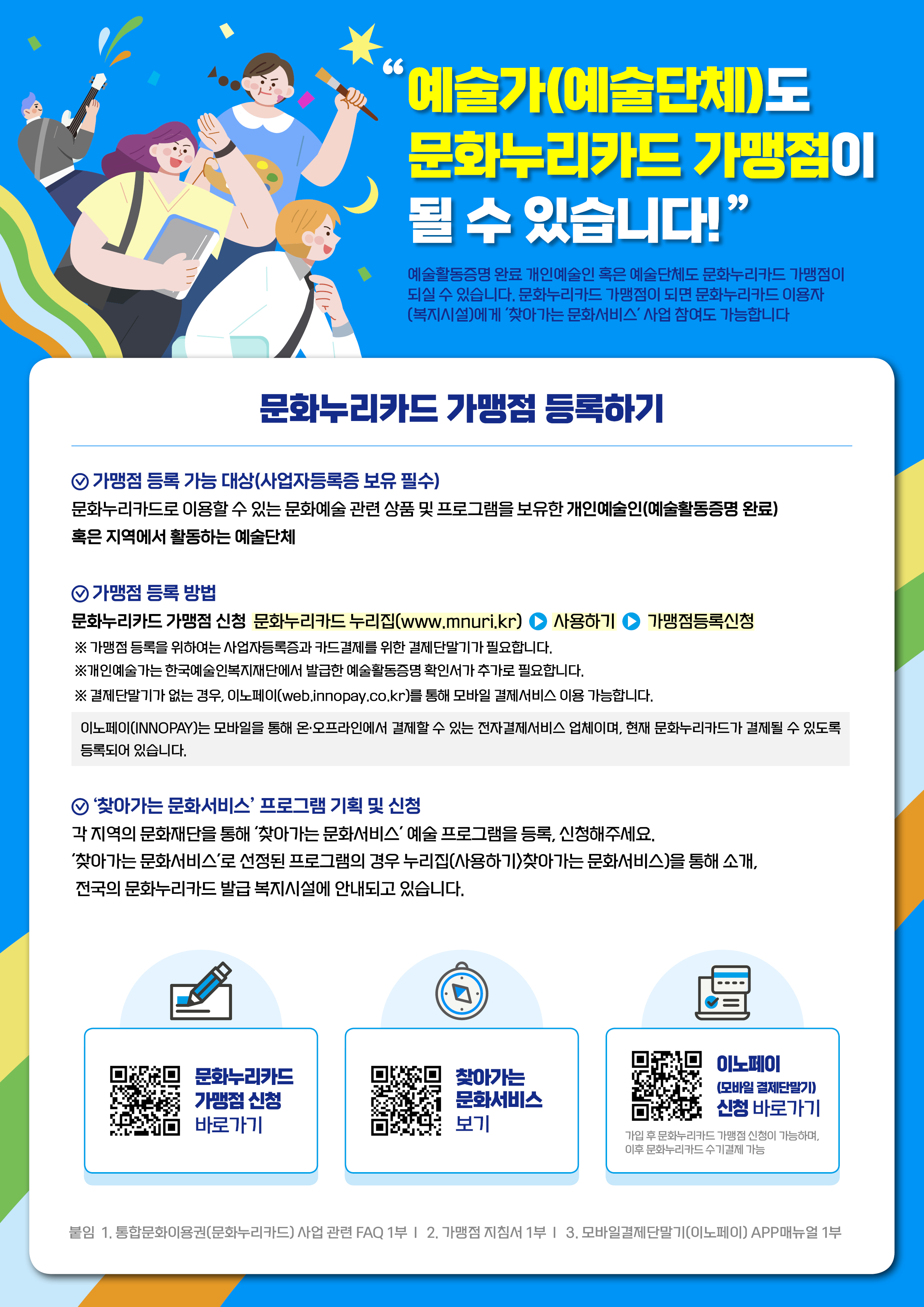[참고] 개인예술인 및 예술단체 문화누리카드 가맹점 등록 안내 https://cafe.naver.com/ggasc/1971