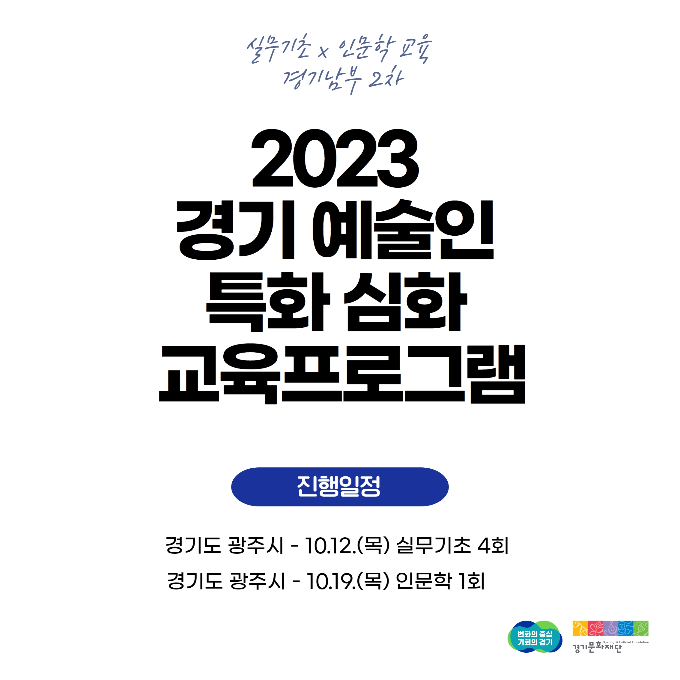 경기문화재단 예술인지원팀은 도내 예술인 지원과 지역 균등 기회 제공을 위해 2023<경기 예술인 아카데미 특화 심화 교육프로그램>를 개최합니다. 경기도 북부 고양에 이어 경기도 남부(광주시)에서 이뤄지는 본 아카데미는, 기초실무 강좌와 인문학 강좌로 구성되어 있습니다.